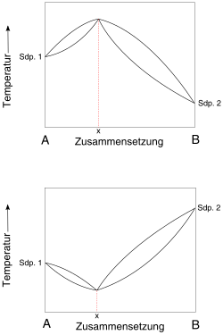 Bei azeotropen Stoffgemischen hat die Siedetemperatur des Stoffgemisches bei einem bestimmten Stoffmengenverhältnis einen Extremwert. Dieser Wert liegt außerhalb des Temperaturintervalles, das durch die Siedetemperaturen der beiden Reinstoffe aufgespannt wird. Bei diesem besonderen Mischungsverhältnis liegt ein Siedepunkt und kein Siedebereich vor.