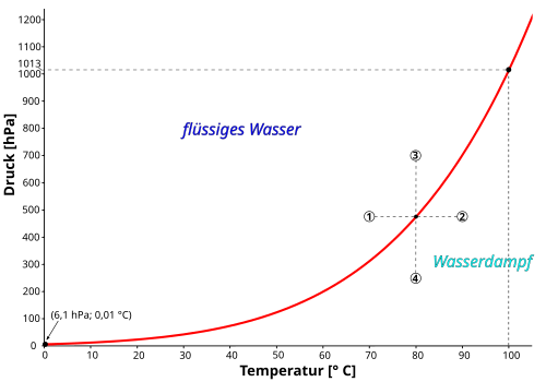 Beispielhafter Ausgangspunkt: Wasser befindet sich im Gleichgewicht mit seiner Gasphase beim Siedepunkt 80 °C und einem Druck von 474 hPa: