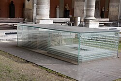 Der akademische Senat der Universität hatte schon am 28. Juni 1990 eine Verlegung in den Arkadenhof beschlossen, scheiterte jedoch zunächst am Widerspruch des Bundesdenkmalamts. Schließlich erfolgte die Versetzung 2006. Die im Zuge dessen geschaffene Glasumhüllung des Kopfes dient sowohl dem Schutz der einige Jahre zuvor beschädigten Plastik als auch der Distanzierung.[2] Der schützende Glassturz aus mehreren Kuben ist zugleich ein Träger von Textbeiträgen und Fotografien. Auf dem äußersten Kubus findet sich ein autobiografischer Erinnerungstext der jüdischen Germanistin, Pädagogin und Schriftstellerin Minna Lachs. „Wir wollten den Siegfriedskopf nicht eins zu eins wieder aufstellen, sondern einer verstärkten historischen Analyse unterwerfen“, sagte Rektor Georg Winckler bei der Aufstellung. Den Auftrag für die Konzeption und Durchführung erhielt das Künstlerpaar Bele Marx und Gilles Mussard.[3]