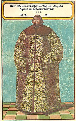 | Sigismund von Herberstein in Russian attire granted to him by Vasily Ioannovich in 1517 (from the drawing of that time)// Sigismund Herberstein. Notes on Moscoviti affairs. - St. Petersburg, 1908. | http://www.booksite.ru/enciklopedia/album/index.htm | Sigismund von Herberstein | Datei:Sigismund von Herberstein in russian dress1.jpg | |