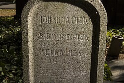 | Grabstein Familiengrab Pick, Neuer jüdischer Friedhof Prag | Eigenes Werk | Friedrichstaps | Datei:Grabstein Familiengrab Pick.jpg | |