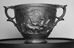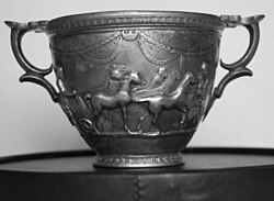 - Der Gefäßmantel, der reliefverziert ist, ist weitgehend unbeschädigt. Auf den durch die Henkel getrennten Seiten A und B ist je eine Szene aus dem römischen Circus abgebildet, gerahmt werden die Darstellungen durch Girlanden.