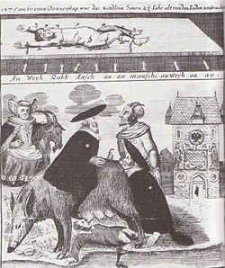 - ↑ Die sogenannte „Frankfurter Judensau“ verbreitete sich in Einblattdrucken und Kupferstichen im 17. Jahrhundert zum antijüdischen Schandbild; Wolfgang Treue: Der Trienter Judenprozeß, S. 375f.