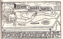Die ersten erhaltenen Darstellungen einer passio – der Geschichte Simons in einer Bilderfolge – sind die Illustrationen zur Geschichte des zu Trient ermordeten Christenkindes. Durch ihr frühes Erscheinungsdatum und ihre Verbreitung hatten die zwölf Holzschnitte einen entscheidenden Einfluss auf die weitere Simon-Ikonographie. Einen weiteren Bilderzyklus von 13 kleinen Holzschnitten mit der passio enthält die ca. 1476/1477 in Augsburg erschienene Übersetzung des Tiberino-Briefes, an dessen Handlungsablauf sowie den Trienter Holzschnitten die Darstellung orientiert ist.[62] Wenige Zyklen der passio finden sich in Fresken und Gemälden, die sehr teuer waren. 1478 wurde für die neue Simon-Kapelle im ehemaligen Haus Samuels von Bartolomeo Sacchetto Fresken geschaffen. Von diesen sind heute nur noch Fragmente zweier Gemälde erhalten, auf denen zum einen die Beratung der Juden untereinander und zum anderen das Martyrium erkennbar sind. Andere erhaltene Zyklen bestehen aus deutlich weniger Bildern wie vier Fresken an der Außenwand der Kirche S. Andrea von Malegno im Val Camonica und in der Kirche S. Pietro von Brebbia. Zyklen der passio Simons sind eher selten. Häufiger treten in der Ikonographie Darstellungen von Simon in einem Bild auf. In den ersten Jahren wurde vorzugsweise das Martyrium Simons dargestellt. Dies erfolgte mit dem Ziel, das Verbrechen der Juden möglichst eindrucksvoll zu schildern, um so den Anspruch Simons auf Verehrung zu untermauern.[63] Im Mittelpunkt steht zumeist das Martyrium Simons. Simon wird auf einer Bank stehend von Juden gehalten oder er sitzt auf dem Schoß Moses. Umringt ist er von mehreren Juden, die verschiedene Foltern an ihm vornehmen. Attribute sind hier Messer, Zangen und Pfrieme zur Marterung und eine Schüssel, die das Blut Simons aufnimmt. Diese ist in Anlehnung an den Messkelch für das Blut Christi manchmal zu einem Kelch verfremdet. Die früheste bekannte Version der Martyriumsszene enthält die Trienter Druckschrift in ihrer vierten Abbildung. Weitere Darstellungen der Martyriumsszene finden sich in der Nürnberger Weltchronik von Hartmann Schedel und der Augsburger Weltchronik.