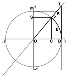 Die y-Koordinate eines Punktes im ersten Quadranten des Einheitskreises entspricht also dem Sinus des Winkels zwischen seinem Ortsvektor und der x-Achse, während die x-Koordinate dem Kosinus des Winkels entspricht. Eine Fortsetzung ergibt eine Definition von Sinus und Kosinus für beliebige Winkel.