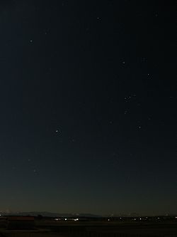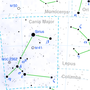 Sirius, Bayer-Bezeichnung α Canis Majoris (Alpha Canis Majoris, α CMa), auch Hundsstern, früher auch Aschere oder Canicula genannt,[12] ist ein Doppelsternsystem des Sternbildes „Großer Hund“. Er ist der hellste Stern am Nachthimmel, beinahe doppelt so hell[A 4] wie der zweithellste Stern Canopus. Von allen Himmelsobjekten erscheinen nur Sonne, Mond sowie die Planeten Venus, Jupiter, Mars und Merkur heller.[A 5] Im Wintersechseck markiert Sirius die südlichste Ecke.