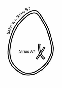 Friedrich Bessel bemerkte 1844 bei der Auswertung langjähriger Beobachtungsreihen eine Unregelmäßigkeit in der Eigenbewegung des Sirius, welche er als den Einfluss eines Doppelsternpartners mit einer Umlaufdauer von etwa einem halben Jahrhundert deutete. Zwar war vier Jahrzehnte zuvor von William Herschel die Existenz von physisch zusammengehörigen Doppelsternen gezeigt worden,[19] aber alle bisher bekannten hatten zwei oder mehr sichtbare Komponenten. Dass der vermutete Begleiter von Sirius bisher von niemandem gesehen worden war, schreckte Bessel nicht ab: „Dass zahllose Sterne sichtbar sind, beweiset offenbar nichts gegen das Dasein zahlloser unsichtbarer“.[20]