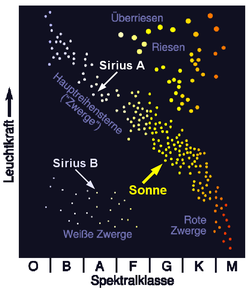 Über Jahrzehnte hinweg blieb Sirius B eine bloße Kuriosität. Nachdem die Anwendung der Spektralanalyse auf das Sternenlicht die Einteilung der Sterne in Spektralklassen erlaubt hatte, konnten Ejnar Hertzsprung und Henry Russell ab etwa 1910 systematische Zusammenhänge zwischen der Spektralklasse eines Sterns und seiner Leuchtkraft aufdecken. Im Hertzsprung-Russell-Diagramm bildeten die (damals untersuchten) Sterne zwei Gruppen: „Zwerge“ und „Riesen“. Nicht in das Schema passte jedoch schon damals der Stern 40 Eridani B, ein schwacher Begleiter von 40 Eridani: Er war gemessen an seiner Spektralklasse viel zu lichtschwach. 1915 konnte ein Spektrum von Sirius B aufgenommen werden, das ihn im HR-Diagramm in die Nähe von 40 Eridani B rückte und zeigte, dass die beiden offenbar Angehörige einer neuen Sternklasse waren. Ihre geringe Leuchtkraft trotz hoher Temperatur zeugte von einer geringen abstrahlenden Oberfläche, also einem kleinen Radius und damit einer immensen Dichte.[27]
