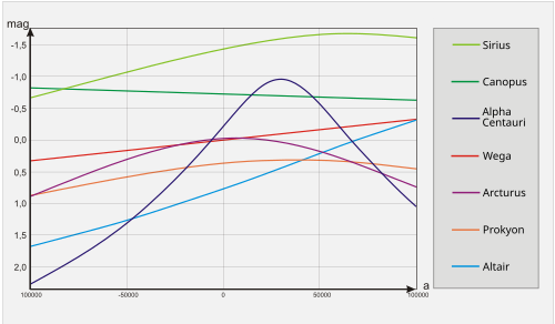 - ↑ Berechnet sich aus scheinbarer Helligkeit und Parallaxe: M = m + 5 + 5·log(Parallaxe) = −1,46 + 5 + 5·log(0,379″) = +1,43 mag (siehe Entfernungsmodul).
