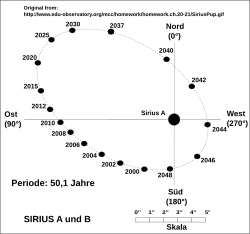 Da die Bahn jedoch um 136,62° gegen die Sichtlinie geneigt ist,[6] sieht der Beobachter die Bahn in Schrägansicht, die sich wiederum als Ellipse, aber mit etwas größerer Exzentrizität darstellt. Die Abbildung zeigt diese scheinbare Bahn, wie sie von der Erde aus gesehen erscheint. Obwohl Sirius A in einem Brennpunkt der relativen Umlaufbahn von Sirius B liegt, befindet er sich wegen der Schrägansicht nicht in einem Brennpunkt der im Diagramm dargestellten perspektivisch verkürzten Ellipse. Aufgrund der Schrägansicht erscheinen dem Beobachter die größtmöglichen und kleinstmöglichen Winkelabstände, die Sirius B auf dieser scheinbaren Bahn durchläuft, etwas kleiner als die oben angegebenen unverzerrten Werte. Sirius B passierte auf seiner wahren Bahn den geringsten Abstand zu Sirius A (das Periastron) das letzte Mal im Jahre 1994,[6] erreichte auf der scheinbaren Bahn den verkürzungsbedingt geringsten Abstand jedoch bereits 1993.[38]