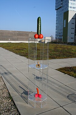 - Martina Schettina, Gurke mit Tomaten. Readymade. Lebensmittel, Acrylsockel. Größe: ca. 100 cm. 2009