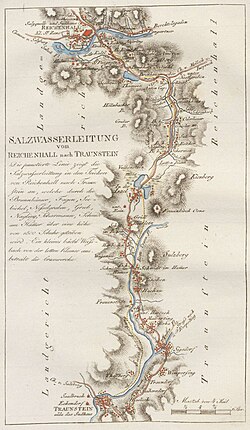 Salzwasserleitung von Reichenhall nach Traunstein ausRiedl, Adrian von / Lentner, Joseph: Reise Atlas von Bajern oder Geographisch-geometrische Darstellung aller bajrischen Haupt- und Landstraßen mit den daranliegenden Ortschaften und Gegenden, nebst Kurzer Beschreibungen alles dessen, was auf und an einer jeden der gezeichneten Straßen für den Reisenden merkwürdig seyn kann. Gewidmet Joseph August Grafen von Toerring, Bd.: 32, , München, 1803 | http://daten.digitale-sammlungen.de/~db/0009/bsb00090578/images/index.html | Adrian von Riedl | Datei:Salzwasserleitung von Reichenhall nach Traunstein (1803).jpg | |