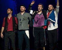 | Coldplay taking a bow after performing in support of their 2008 tour. From left to right: Guy Berryman, Jonny Buckland, Chris Martin, and Will Champion | The End | Karl Axon from Liverpool, England | Datei:Coldplay - December 2008.jpg | |