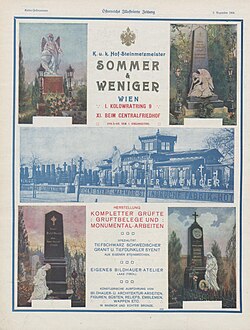 | Werbung von Sommer & Weniger mit Ansicht des Comptoirs am Wiener Zentralfriedhof. | Die Gross-Industrie Oesterreichs: Festgabe zum glorreichen fünfzigjährigen Regierungs-Jubiläum Seiner Majestät des Kaisers Franz Josef I. dargebracht von den Industriellen Oesterreichs 1898 . Band 2., Wien 1898. Verlag von Leopold Weiss. S. 70 | unbekannt | Datei:Gross-Industrie Oesterreichs 2 Sommer-Weniger 70unten-RZ.JPG | |