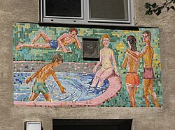 Am Wohnhaus Ecke Uhlandgasse 2 befinden sich ein Relief mit der Darstellung eines von der Sonne beschienenen nackten Mannes und zwei mit SG signierte Mosaikbilder aus dem Jahre 1966, die familiäre Badeszenen abbilden.