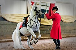 | A Lipizzaner stallion (Pluto Montenegra) is performing a levade during an open air performance of the South African Lipizzaner School. | Eigenes Werk | NJR ZA | Datei:South African Lipizzaners-001.jpg | |
