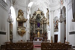 Die rechteckige Saalkirche mit reichem Stuckdekor an der Decke hat an beiden Seiten zwei Altarnischen. Die zweitürmige Kirchenfassade war ursprünglich im hochbarocken Stil, wurde jedoch 1821 im klassizistischen Stil umgestaltet. Die Orgel stammt aus der Werkstatt Georg Hradetzky und wurde 1970 aufgestellt.[4]