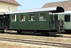 | Eisenbahnwagen am Gelände des Eisenbahn- und Bergbaumuseums in der oberösterreichischen Marktgemeinde Ampflwang. Der Personenwaggon wurde 1912 von der AG für Fabrikation von Eisenbahnmaterial in Görlitz ( Waggonbau Görlitz ) hergestellt und 1957/58 von der ÖBB-Hauptwerkstätte Simmering umgebaut. Der zweiachsige Waggon hat 44 Sitzplätze und wiegt rd. 15 Tonnen. Der betriebsfähige Waggon, im Eigentum der „Österreichische Gesellschaft für Eisenbahngeschichte“ (ÖGEG), hat die Nummer 5081 0211 021-2P und hatte in der Vergangenheit die Nummern: DR 65844, DR 110799, 6999, 39764: 1 . | Eigenes Werk | C.Stadler/Bwag | Datei:Ampflwang - Eisenbahn- und Bergbaumuseum, Personenwagen Bih 39758.JPG | |