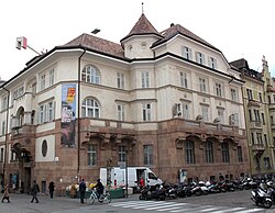Direkt gegenüber dem Sparkassengebäude steht das 1901–1905 im Überetscher Stil errichtete Museumsgebäude. Die Pläne dafür stammen vom akademischen Maler Alois Delug, die Bauleitung hatte Stadtbaumeister Wilhelm Kürschner über. Die Gestaltung der Innenausstattung erfolgte nach Plänen des akademischen Malers und späteren Museumsdirektors Tony Grubhofer.[7] In den Jahren 1934–1938 ließ die faschistische Stadtregierung das Stadtmuseum umbauen und alle deutschen Stilelemente, insbesondere den Turm und die Zinnen entfernen.[8] 1992/93 wurde der Museumsturm wieder aufgebaut. Er ist der einzige öffentlich zugängliche Turm im Zentrum von Bozen.