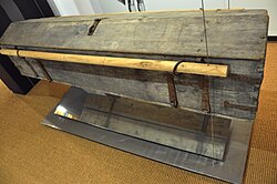 | Josephinischer Gemeindesarg ("Klappsarg") im Bestattungsmuseum Wien. Josephinischer Gemeindesarg, dank unten öffnender Doppelklappe mehrfach zu verwenden, darunter ein kleinerer für ein Kind, Bestattungsmuseum Wien , 2007. An den 4 Eisenringen wird der Sarg über die Öffnung des Grabs gehalten, der Hebel mit Ring (links) wird nach links gedrückt, um die Klappen freizugeben. Sichtbar am Bild sind auch der abhebbare Deckel, die verzinkte Fügung des Korpus und drei Scharnierbänder zu einer Klappe. | per Mail for upload | User:Ekehnel | Datei:Josephinischer Gemeindesarg Bestattungsmuseum.jpg | |