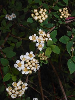| Rosaceae (rose family) » Spiraea canescens spy-REE-ah -- meaning, wreath kan-ESS-kens -- meaning, grey hair or greyish commonly known as : grey stem spiraea • Chinese : 楔叶绣线菊 xie ye xiu xian ju • Hindi : झाड़ मैराला jhar mairala Native to : Himalayas (1500-4000 m) References : Flowers of India • NPGS / GRIN • Plants For A Future • eFlora | Spiraea canescens | Dinesh Valke from Thane, India | Datei:Spiraea canescens (2561348276).jpg | |