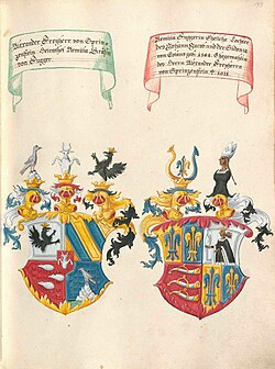 | Wappen des Alexander Freiherr von Sprinzenstein | http://daten.digitale-sammlungen.de/~db/0004/bsb00042105/images/ | Autor/-in unbekannt Unknown author Abgeleitetes Werk: Hannes 24 | Datei:COA Sprinzenstein Fugger EB.png | |