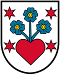 Blasonierung: „In Silber zwischen vier roten, sechsstrahligen Sternen in den Ecken ein rotes Herz, aus dem oben in der Mitte an blauen Stengeln drei blaue, eins zu zwei stehende Vergissmeinnichtblüten mit goldenen Butzen wachsen.“