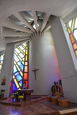 Der Bau weckte zuerst Widerstand in der Bevölkerung. Neben dem Hauptraum wurde die Taufkapelle angebaut, die mit ihm durch eine spiralförmige Rampe verbunden ist. Als Glockenträger dient ein Campanile,[2] das Kruzifix der Kirche stammt von Ulf Mayer, Tabernakel, Leuchten, Ewiges Licht und Altarkreuz von Karl Huber, einem Grazer Goldschmied, eine geschnitzte Madonna vom Liebenauer Holzschnitzer Heinrich Bliemegger.