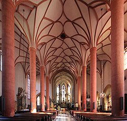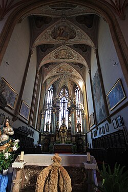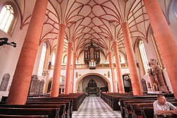 Das Gewölbe der dreischiffigen, sechsjochigen Hallenkirche wird von zehn Rundpfeilern getragen. Das westliche Säulenpaar ist durch die dreiachsige Orgelempore verbaut. Das reiche Schling- und Netzrippengewölbe ruht im Gewölbeansatz auf kleinen Konsolen mit Steinmetzzeichen. Das östliche Joch ist drei Stufen, der dreijochige Chor vier Stufen erhöht. Die sechs dreiteiligen Chorfenster sind mit reichem Maßwerk ausgestattet. Das barock umgestaltete Kreuzrippengewölbe ist mit reichen Stuckornamenten und Freskenmedaillons geschmückt. In den drei mittleren, breit gestreckten Dreipassformen ist je eine Allegorie der Dreifaltigkeit abgebildet. In den Zwickeln sind Malereien mit Engeln vom Ende des 17. Jahrhunderts. Das Gewölbe ruht auf dreifach abgetreppten Wanddiensten mit Stäben und figürlichen Konsolen. An der Südwand sind Adam und Eva, daneben eine Maske mit reichen Blattornamenten dargestellt. Das überlebensgroße Wandbild des heiligen Christophorus an der Chorsüdwand stammt aus der Mitte oder dem dritten Viertel des 15. Jahrhunderts und wird Thomas von Villach zugeschrieben.