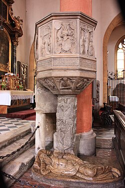- Das Epitaph des Jörg und der Barbara Seenuß von 1579 ist mit reichem Wappen geschmückt.