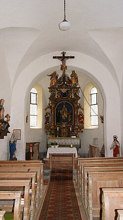 | Kirche St. Leonhard in St. Leonhard zwischen Bings und Oberradin, Bludenz , Vorarlberg , Österreich - Blick zum Altar. | Eigenes Werk | Asurnipal | Datei:St-Leonhard-Kirche-Innen-03.JPG | |