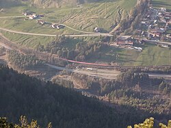 | St. Leonhard (links oben) vom Davennakopf. Der EC 164 "Transalpin" überquert das Grubser Tobel. Rechts Oberradin. | Eigenes Werk | 32-Fuß-Freak | Datei:St leonhard.jpg |