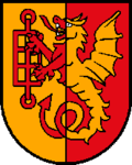 Blasonierung: „Gespalten von Gold und Rot mit einem aufgerichteten, einen Rost pfahlweise haltenden Drachen in gewechselten Farben.“