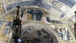 Das Tonnengewölbe wiederholt das Bildprogramm der Apsis und stellt zentral eine monumentale Majestas Domini dar. In der Apsis war die diesbezügliche Darstellung ja von jüngeren Fresken verdeckt worden. Christus in der Mandorla wird von dekorativen Bändern eingerahmt. An den Ecken erscheinen die vier Evangelistensymbole. Als gotische Erweiterung dieses Bildthemas sind auch noch vier lateinische Kirchenväter dargestellt, die unter Baldachinen thronen. Der blaue Hintergrund erweckt den Eindruck eines Sternengewölbes.