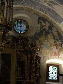 An der Westwand ist eine traditionelle Darstellung des Jüngsten Gerichts zu sehen gewesen. Sie wurde aber durch die Fenster- und Türausbrüche im 17. Jahrhundert weitgehend zerstört. Nur die posauneblasenden Engel im oberen Bildbereich und ein Stück des thronenden Christus sind noch erhalten.
