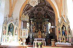 Der spätbarocke Hochaltar zeigt im Mittelbild die Heiligen Nikolaus, Petrus und Margareta. Über den Heiligen halten Engel ein Modell des Petersdoms. Das Mittelbild wird von den Statuen der Heiligen Josef und Johannes der Täufer flankiert. Über den Opfergangsportalen stehen Fanz Xaver und Katharina von Siena. Die Engel über dem Mittelbild halten eine Kartusche mit der Aufschrift „Jesus ist wunderbar in seinen Heiligen“. Am gesprengten Segmentgiebel sitzt Gottvater. Über den zwei vorschwingenden Säulen stehen der heilige Paulus und eine Heilige.