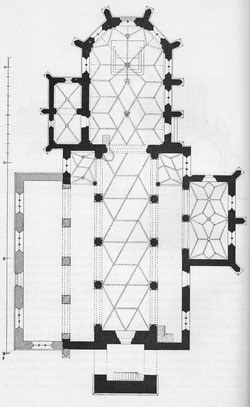 Die Kirche[29] wirkt durch die das südliche Seitenschiff abschnittsweise begleitende Dalberger-Kapelle und das 1878 angebaute nördliche Schiff in diesem Bereich fünfschiffig.[30] Mit dem 1904/1905 zwischen versetztem Chor und Langhaus eingefügten Bauteil wirkt die Anlage als habe sie einen kreuzförmigen Grundriss. Nördlich des Chores wurde eine zweijochige Sakristei angebaut.[31] Auch der Westturm wurde im Zuge dieser umfassenden Neugestaltung erhöht.[32] Er hatte ursprünglich eine offene Halle.[33]