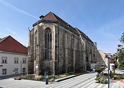Das 3-jochige Langhaus mit einem eingezogenen gleich hohen 2-jochigen Chor mit Fünfachtelschluss steht frei am Johannes-von-Nepomuk-Platz, an der Wiener Straße, und der Petersgasse und ist westlich mit dem ehemaligen Kloster und heutigen Stadtmuseum baulich verbunden. Die Strebepfeiler sind zweifach abgetreppt spitzkantig in eine Spitze gipfelnd wohl aus dem 3. Viertel des 14. Jahrhunderts und nördlich rundbogig übergiebelt mit je einem Wappenschild eines ehemals mit 1456 bezeichnet. Die südlichen Strebepfeiler wurden um 1458 an der zweiten Abtreppung mit einem wappenschildbesetzten Rundbogengiebel versehen, eines ehemals mit 1458 bezeichnet. Am Chorschlussstrebepfeiler ist ein von ehemals vier reliefierten Wappen mit der Darstellung eines Fisches erhalten. Die Kirche hat südlich und beim Chorschluss dreibahnige Maßwerkfenster, wohl aus dem 3. Viertel des 14. Jahrhunderts, wobei nach 1945 das Maßwerk erneuert wurde. Südseitig ist im 2. Joch des Langhauses ein bemerkenswertes spätgotisches Südportal, ehemals mit 1465 bezeichnet. Das Südportal ist in Österreich solitär ein rundbogiges, rechteckig gerahmtes und verstäbtes Portal mit Durchdringung der sphärisch und rechteckig verlaufenden Stäben. Über dem Portal sind in einem beinahe quadratischen Feld in zwei Zonen in einer engen Abfolge sieben Statuettennischen. Weiters finden sich Bogenansätze einer ehemals vorhandenen unterwölbten Schutzdachkonstruktion für das Portal. Die parallel zur ehemaligen Stadtmauer verlaufende Nordfront der Kirche ist fensterlos und hat am Langhaus eine erhöht liegende flachbogige Türöffnung und teils vermauerte Durchgänge in den Strebepfeilern, welche wohl Reste des ehemaligen Wehrganges anzeigen.