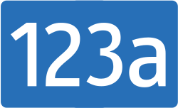| Sign of Bundesstrasse 123a in Austria | Straßenverkehrszeichenverordnung (StVZVO), BGBl. 1998 II 1205-1227, 1217. | Rl91 | Datei:B123a-AT.svg | |
