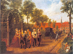 | Rückkehr von der Kavalierstour der Söhne des Grafen von Stadion nach Warthausen um 1780Privatbesitz von links: Die Mutter Maria Ludovika, geb. Freiin Zobel zu Giebelsdtadt (1740 - 1803), der ältere Sohn Friedrich Lothar (1761 - 1811), die Tante Marie Therese Gräfin von Spaur, geb. Stadion (1729 - 1773), der Vater Franz Konrad (1736 -1787), der jüngere Sohn Johannes Philipp (1763 - 1824), der Oberamtmann Matthias Schöppl, der Hofmeister Karl Kolborn (1744 - 1816) | Mark Hengerer, Elmar L. Kuhn (2006) Adel im Wandel; Oberschwaben von der Frühen Neuzeit bis zur Gegenwart , 1, Ostfildern ISBN : 978-3-7995-0216-0 . | Johann Heinrich Tischbein der Ältere zugeschrieben | Datei:Adel im Wandel12.jpg | |