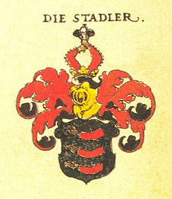 Blasonierung: Das Stammwappen der Stadler zeigt in schwarzem Schild drei rot gewandete Arme (mit geschlossener Hand, es gibt auch Varianten mit offener Hand), weißem vorstehendem Hemd (oder Umschlag) und seitlich vier (sieben) goldenen Schellen oder Knöpfen;[2] die Helmzier besteht aus zwei abgewinkelten Armen, die drei Straußenfedern (zwei schwarze, eine weiße) in die Höhe halten, die Helmdecken sind rot-schwarz.