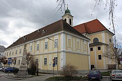 | Stadtarchiv Wiener Neustadt , ursprünglich Jesuitenkolleg, davor der Kaiserbrunnen, mit dem Kaiserbrunnendenkmal aus dem 18. Jahrhundert, dahinter die ehemalige Jesuitenkirche, jetzt Vorstadtkirche (Wiener Neustadt) | Eigenes Werk | Anton-kurt | Datei:StadtarchivKaiserbrunnenWienerNeustadt.10Ac.jpg |