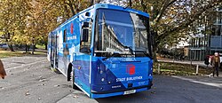 „MobiBook“ heißt der Bücherbus der Bibliothek. Er hat eine Länge von 13 Metern.[2]
