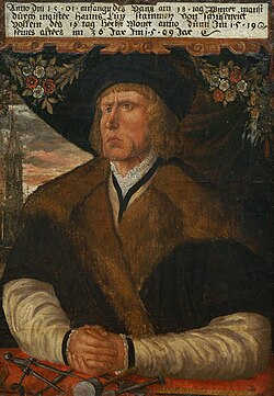 | Hans Lutz, Steinmetz aus Schussenried (* um 1473 in Schussenried, † 1525; kam 1499 als Parlier nach Bozen). Im Hintergrund der Turm der Marienkirche in Bozen. Oben Legende mit Renaissance-Zierrahmen. | http://tirolerportraits.it/ Portrait Nr. s00511 | Silvester Müller (?) | Datei:Hans Lutz 1509.jpg | |