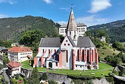 | Südsüdostansicht der Stadtpfarrkirche Hl. Matthäus in der steiermärkischen Stadtgemeinde Murau und dahinter das Schloss Obermurau. Die Kirche wurde 1284 von Otto I. von Liechtenstein gestiftet und 1296 geweiht. Sie ist eine bedeutende frühgotische Kreuzbasilika mit Vierungsturm. Im Jahr 2006 wurde die Kirche außen renoviert und dabei erhielt sie wieder ihre ursprüngliche gotische Farbgebung: 1 . | Eigenes Werk | C.Stadler/Bwag | Datei:Murau - Pfarrkirche.JPG | |
