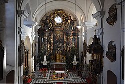Der durch ein Chronogramm auf das Jahr 1711 zu datierende Hochaltar füllt den gesamten Chorschluss aus und wird Marx Schokotnigg zugeschrieben. Insgesamt sechs Säulen tragen die Himmelsglorie mit ausgespartem Rundfenster . Vor dem mit Engelsfiguren flankierten Rundfenster ist die Darstellung einer Taube als Symbol des Heiligen Geistes angebracht. Das von einem Baldachin umgebene Altarblatt zeigt in einem Gemälde von Franz Carl Rempp den Tod des heiligen Josef. Jeweils zwei Statuen links und rechts vom Altarbild stellen die Heiligen Teresa von Ávila, Elija, Elisäus sowie Maria Magdalena von Pazzi dar. Im Jahr 1888 wurde der Hochaltar von Wilhelm Sirach neu vergoldet. Das freistehende Tabernakel von 1858 zeigt an den Türen eine Szene mit den Emmausjüngern. Die Mensa des Hochaltars wurde 1908 von dem Steinmetzen Grein geschaffen.[5]