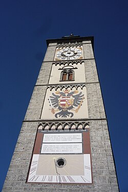Der Eingang befindet sich im Erdgeschoß auf der Südseite (eine automatische Tür mit Münzeinwurf); darüber ist eine gemäß der Inschrift aus der Zeit des Turmbaus stammende Sonnenuhr aufgemalt. Sie füllt ein sechs Meter breites und drei Meter hohes Feld mit einfachen Fresken aus. Der Schattenstab sowie die längs der dreiseitigen Umrandung angebrachten Stundenzeichen ermöglichen ein genaues Ablesen der Uhrzeit.[24]