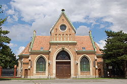| Aufbahrungshalle 2 auf dem Stammersdorfer Zentralfriedhof, ab 1966 Standort des bis 2002 vollständig rückgebauten Krematoriums | Eigenes Werk | Michael Kranewitter, Vienna | Datei:Stammersdorfer Zentralfriedhof - Aufbahrungshalle 2.jpg | |