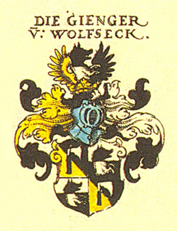 | Wappen der Gienger von Wolfsegg (Wolfseck) | Siebmachers Wappenbuch, Teil 1 | Johann Siebmacher | Datei:COA Gienger v Wolfseck.png | |