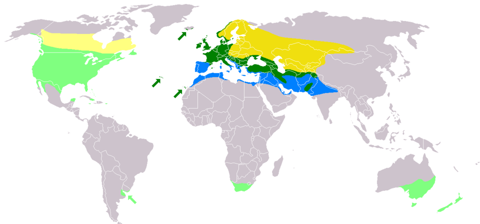 Gelb: Brutgebiet im Sommer; blau: Winterquartier; grün: ganzjährig.
